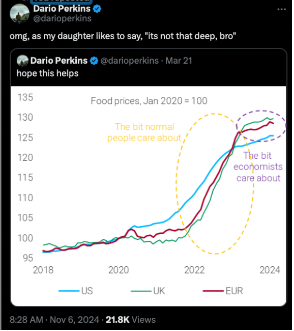 There are going to be many reasons behind this. And it’s a very tough year to be an incumbent. But it does seem that for a significant segment of US voters, the higher cost of living and other deteriorations in daily life overrode any fear of an openly fascist government. The fact that the US inflation rate had already fallen substantially would be immaterial for many people. The bit that most people care about is the now-permanently higher level of everyday prices: