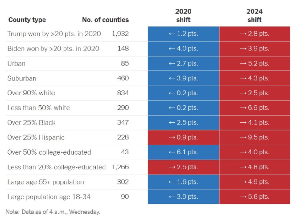 The nature of Trump’s election victory was shocking. Trump did better in almost every county than he did in 2020, and the sheer breadth of constituencies that tilted Republican compared to 2020 is notable: