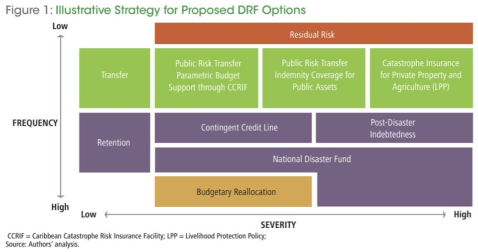 In the absence of most of those provisions, for most countries, even expensive and limited insurance might be appealing. Jamaica’s government in fact has multiple sovereign insurance arrangements, as this schematic from the finance minister, via Artemis.bm, shows:
