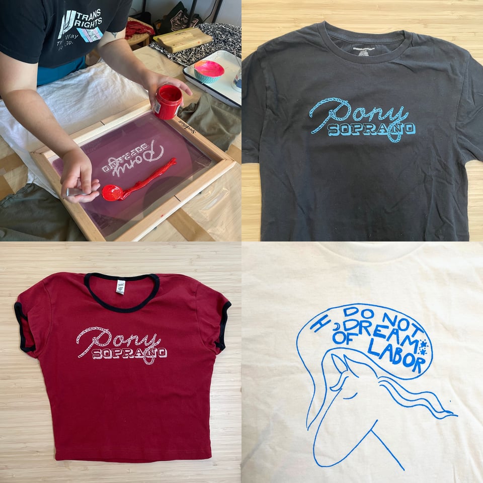 In the interest of loving our planet and reducing textile waste, these shirts were hand-thrifted and hand-printed by yours truly (Annie and Tessa), so no two shirts are exactly alike! Behold the incredible variety…