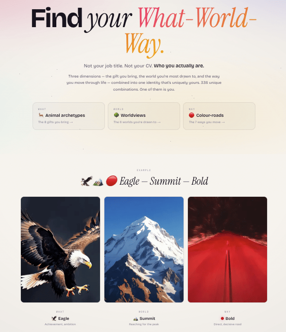 The cards are for the new "what-world-way" result on the platform — three words that come out of three short assessments stitched together: an animal (your archetype drawn from enneagram types — are you the protector, the mediator, etc), a world (the world you most feel at home in), and your way (your style, how you approach the world). Three hundred and thirty-six combinations in total. Mine, for what it's worth, is Fox-Horizon-Deep — wired for individuality, patterns and reflection. The image below shows my share card as it will soon appear on Facebook.
