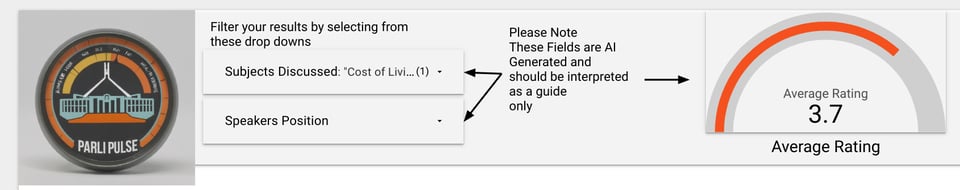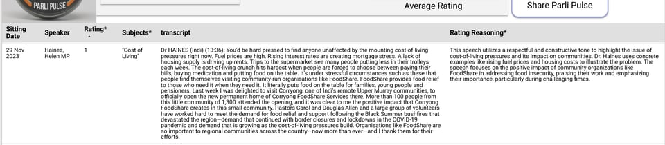 Here’s an example from the dashboard: a single speech in the House of Representatives on the Cost of Living, and the rating given by the AI LLM (1 - very constructive) as well as a descriptive reasoning as to why that rating was given.