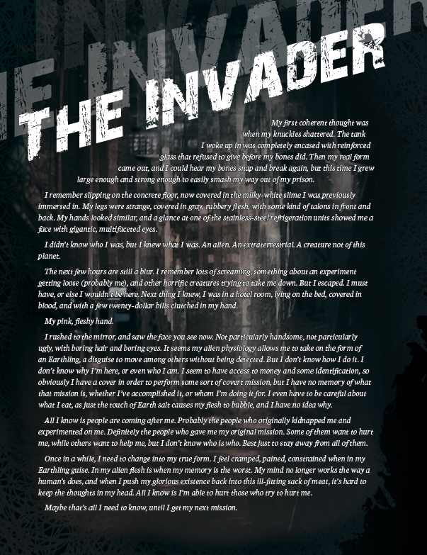 Another of my Tasty Bits for Curseborne released last week. This time it’s “The Invader,” which is a horribly confused person who escaped from torment and came to the logical conclusion they’re a secret space alien instead of a different kind of monster. It’s a fun example of how you can play with the various horror spaces that Curseborne offers.