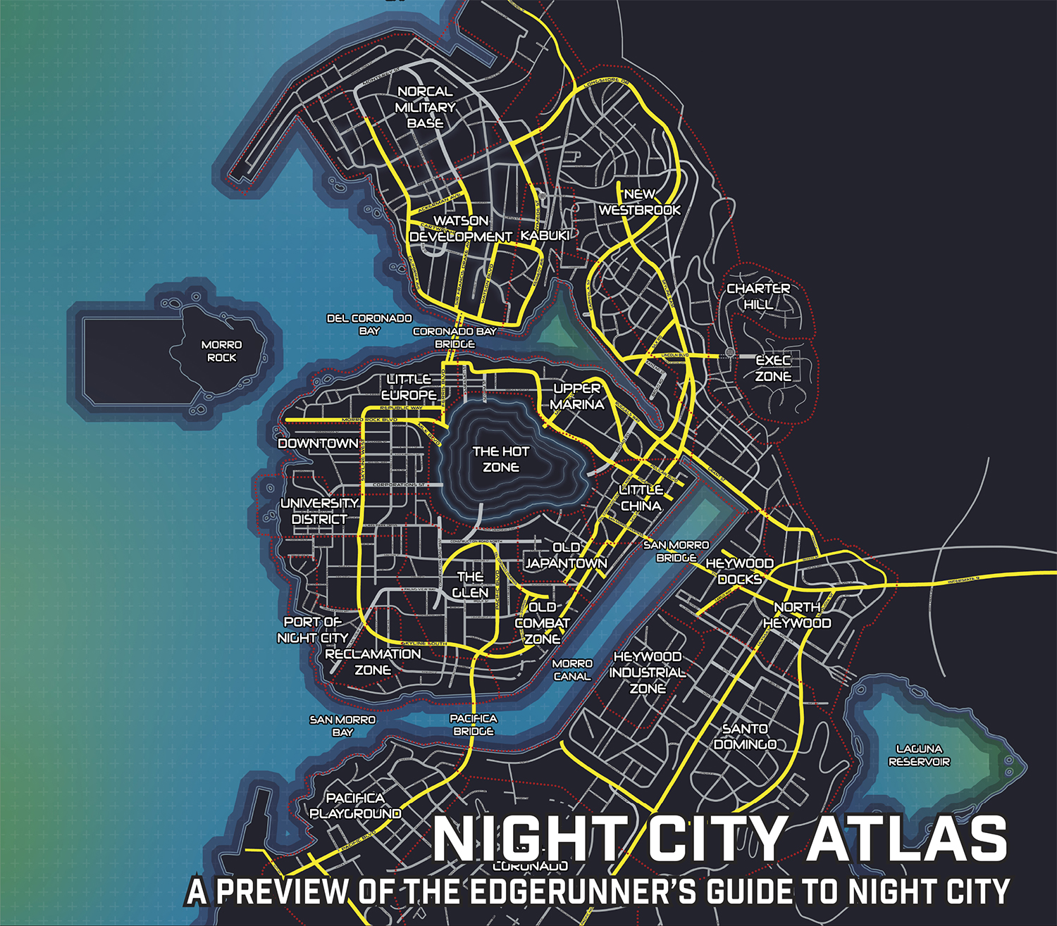 This is a preview of the upcoming book The Edgerunner’s Guide to Night City. It’s a free download of the Night City map, along with a short PDF telling you all the key locations. Obviously you’ll see more of my work in the full book, but if you poke around Little Europe, you’ll get a taste of what I’ve been up to in 2045….