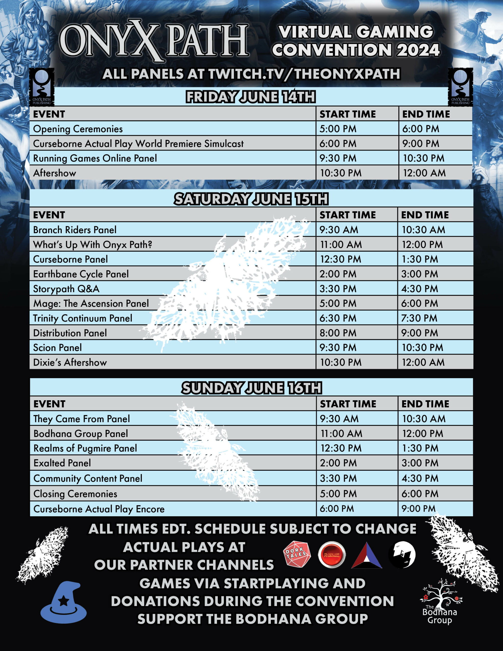 Next weekend I’m at a con again, but at least this time I don’t have to leave my house, because it’s Onyx Path Con! Our online convention will be on the Onyx Path Twitch channel, as well as other Twitch partners. Here’s a schedule of the panels below — I’m on about half of them, so tune in during the weekend, and odds are you’ll see me on there!