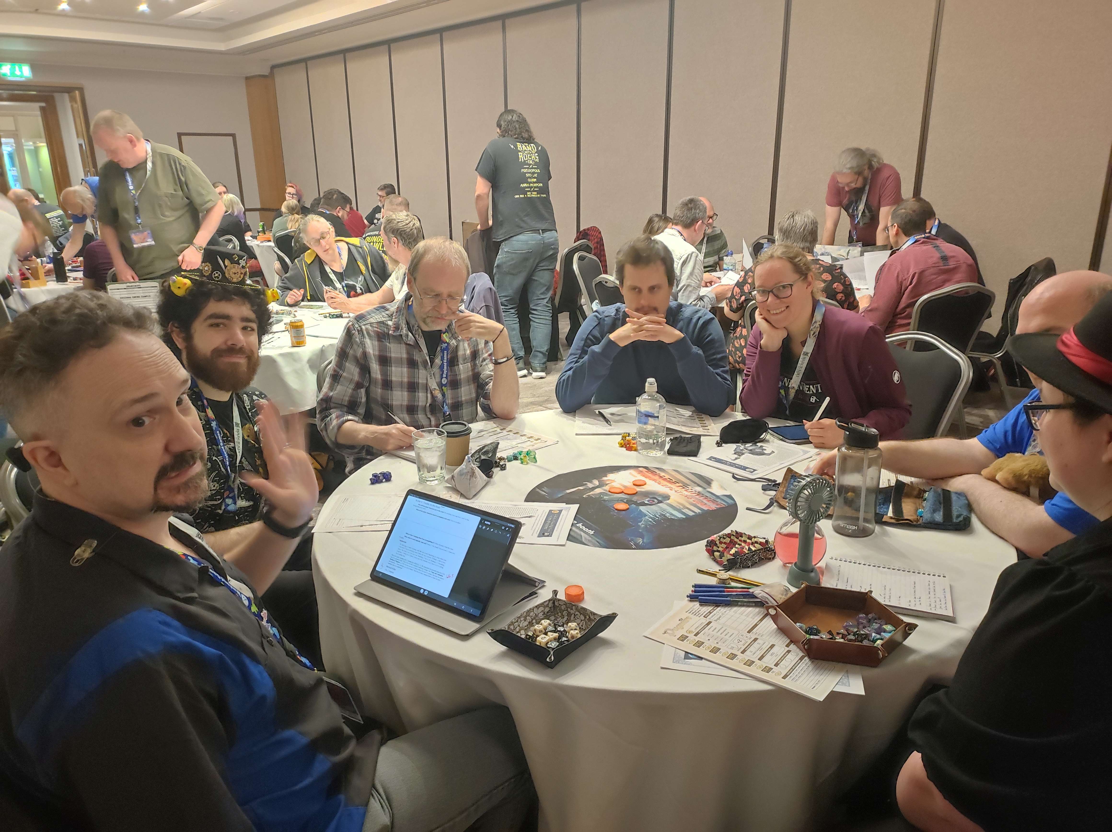The photo is of me running the first-ever game of Curious Cats of Mau, and it went really well. I had some problems printing the character sheets, which led me to ask my friend Matthew Dawkins to print them up, but his printer also had issues, so I had to scramble and get them printed at a print shop in Coventry for far too much money. Also we had a couple of small miscommunications with the convention staff, but honestly every convention has little problems here and there. What’s important is that all the players had a great time, and many of them were completely new to Realms of Pugmire, so I’m hoping they’ll consider pre-ordering the game.