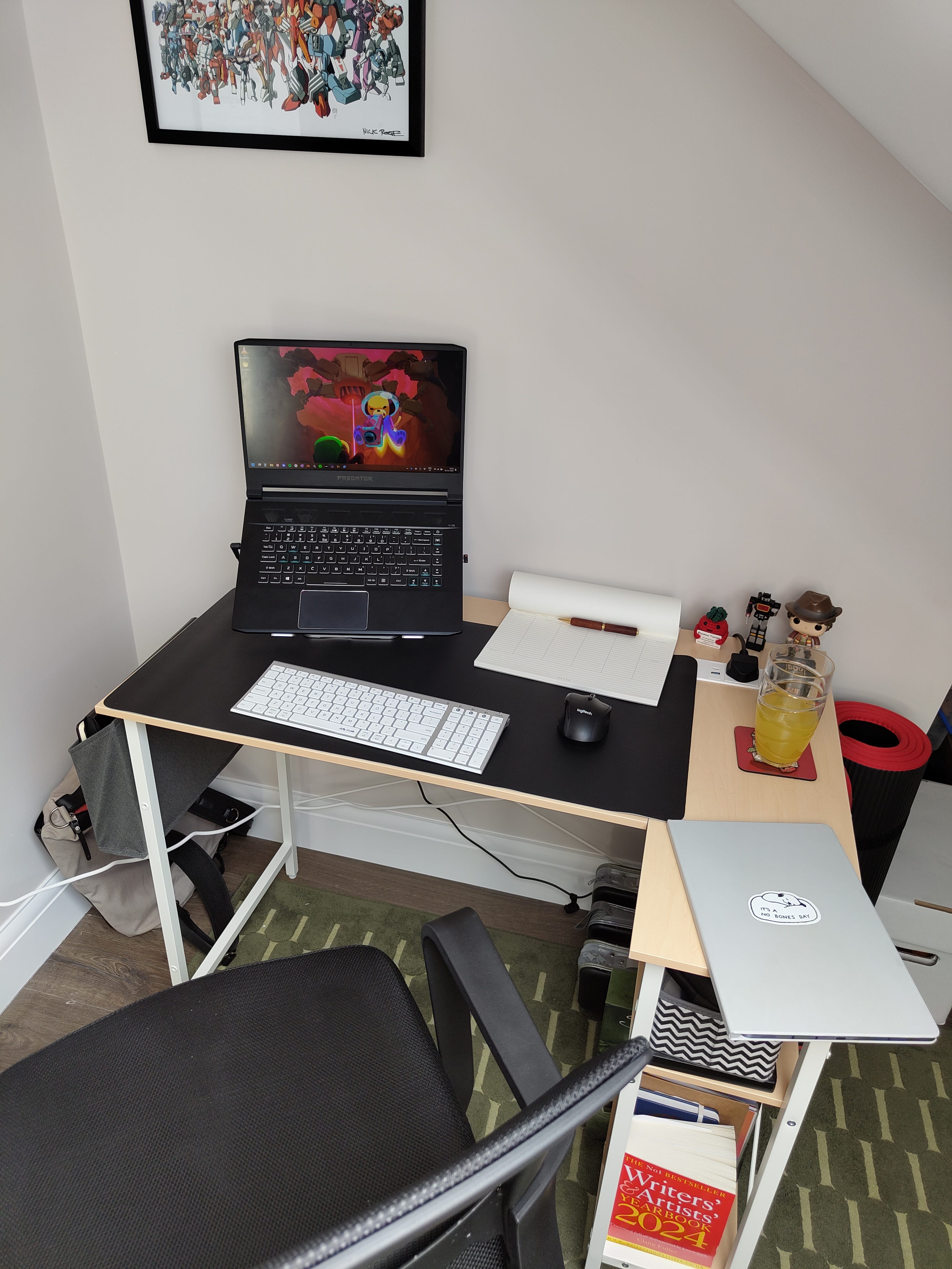 That’s a new desk — we had two desks in the old flat and three people who needed work-from-home offices, so I decided to purchase a new one for my space. It also seems that the monitor I had at the coworking space survived the trip but something got knocked around and it won’t receive a signal now. I figured, since I was setting up a new space, I could wait and get a monitor that makes sense for where I work now rather than where I was working, which is why I just have the laptop on a stand.