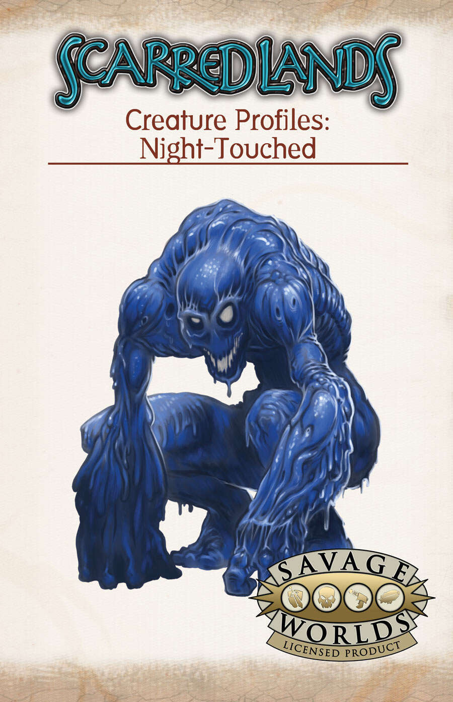 Night-touched are unholy horrors created though the union of demonic energies and the essence of the shadow realm. In their natural state, night-touched have extremely smooth skin with a rubbery feel to it. Their skin is a deep midnight blue, aubergine, or obsidian color that seems to absorb any light that touches it. The night-touched have internal organs, but like those of undead creatures, they do not really function. They have thick, dark green blood that oozes slowly out of wounds, rather than spurting or pulsing like that of a living creature.