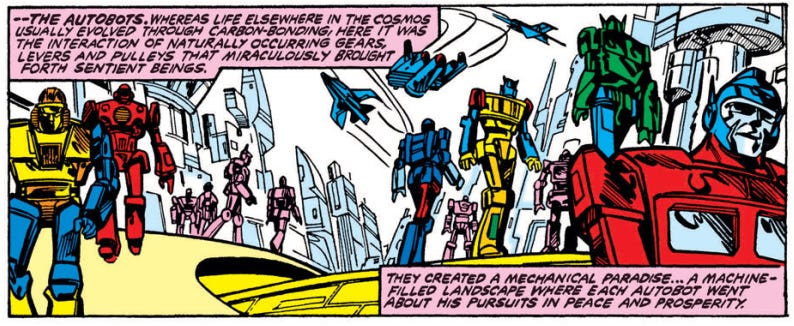 I’ve been a fan of Marvel comics since the early 1980s. I have fond memories of collecting issues of Fantastic Four, Iron Man, G.I. Joe, and, of course, The Transformers. Even before I became a “proper” collector, I had stacks of well-worn issues of comics shoved into the drawers under my bed. At night I would pull a few out and reread them, to the point where certain issues are burned into my mind even today. Like this panel from the first issue of The Transformers.