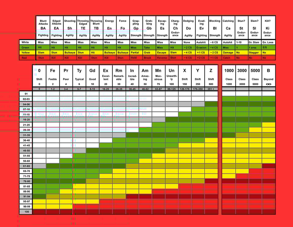 Because I started designing games myself in the late 90s, my own design instincts still err on the side of fewer charts whenever possible. Occasionally they’re useful for displaying key information, but I try to avoid introducing them as key gameplay elements, because I had so internalised the mantra that looking up things on a chart takes too much time. And yet, the current Marvel RPG (Marvel Multiverse Role-Playing Game) has a one-roll system, and it works great, but it doesn’t take appreciably less time than looking up the results on a big chart from 1986. Which got me thinking that how we use charts in game design is perhaps more of a concern than merely the existence of charts.