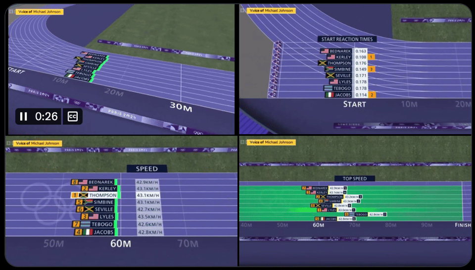 The Olympics 100m really captured everyone's attention – I received multiple tips about the excellent use of data visualization for the Olympics 100m race. Starting with the dataviz-heavy BBC coverage, for example.