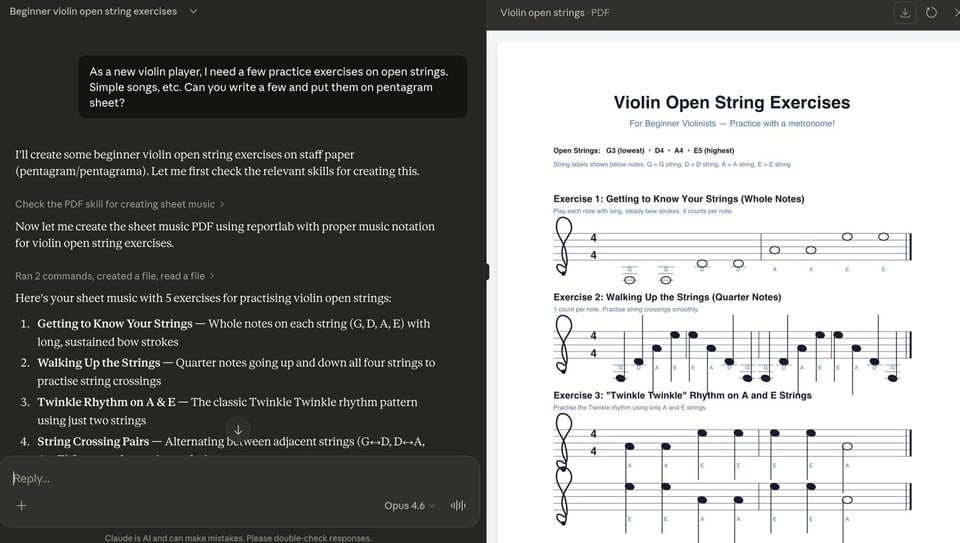 Last week I took my first ever violin lesson. TL;DR – my great-grand father had a musical instruments shop until the late 60s, and we found this old broken violin. I got a local luthier to fix it, and decided to take a few lessons to connect a bit more with my family history. And it looks like I've found a new use for Claude:
