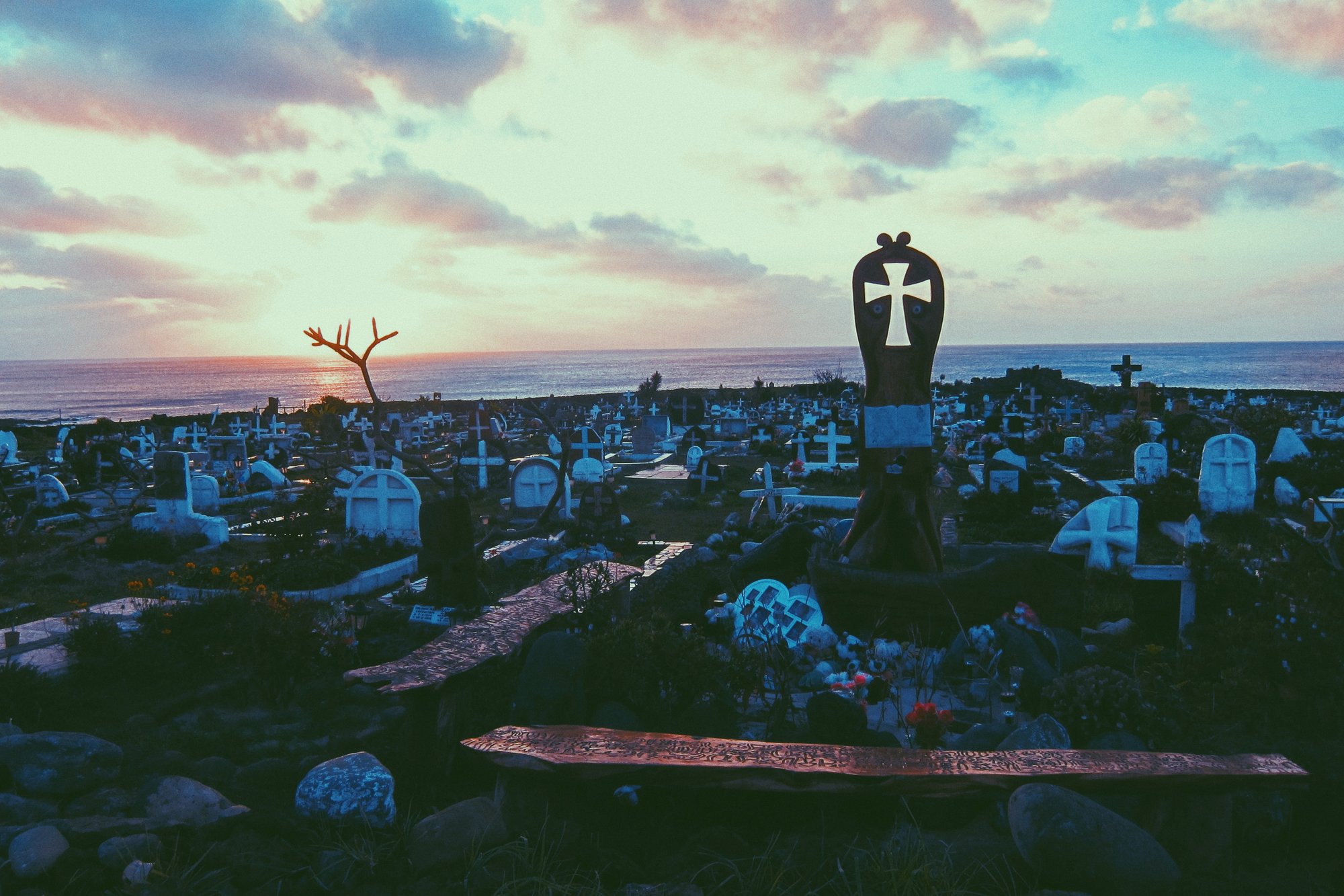 It is early, the morning after a national holiday, and the empty ramada flaps white plastic, abandoned a few hours ago as the sun scratched the caldera, the drums fell silent, and there was only the wind. It is a constant. Howling off the Pacific, in conversation with the moai that face away, squat, sulky children with stony expressions, backs turned.