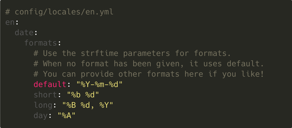 Dates are also often formatted into specific formats within an application by calling to_s(:date_format), which is deprecated now in favor of to_fs(:date_format). If you want to use a custom format, you can do so in the locale file: