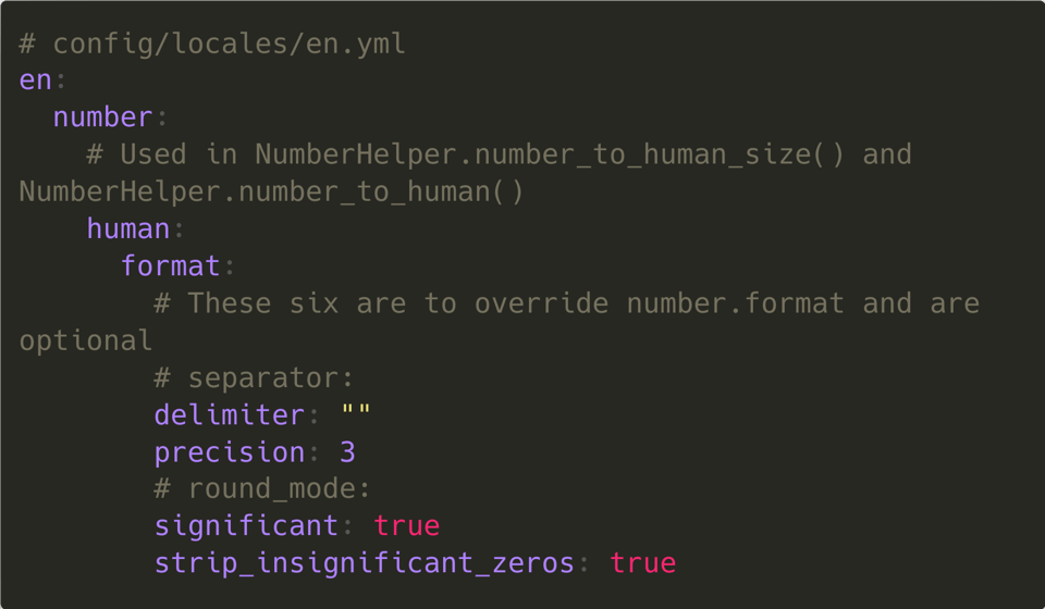 Active Support is a collection of utility classes and extensions to Ruby core and standard library classes. It provides quite a few valuable data formatting helpers, and if you want to change their formatting settings globally, you can do so by utilizing Rails’ localization.