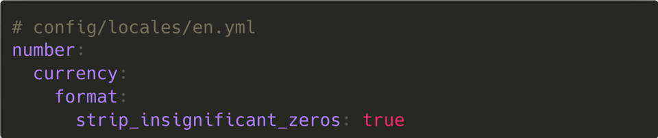 One such a helper is number_to_currency, which takes precision, unit, delimiter, format, negative_format, and strip_insignificant_zeros as options when you call the helper. If you want to strip insignificant zeros globally, instead of passing the same option over and over to the helper in your code, you can just change the option in your locale file: