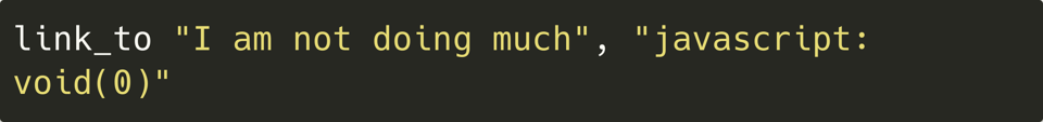 While we are talking about link_to, I’d like to mention something about this helper. The second parameter accepts a string for the href attribute of the a tag. The HTML specification permits various protocols for that attribute, including javascript, so for instance, you can make a dummy link with the following: