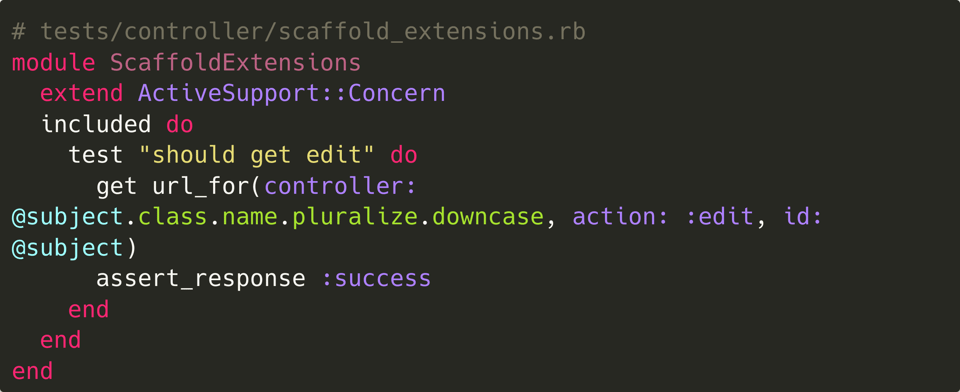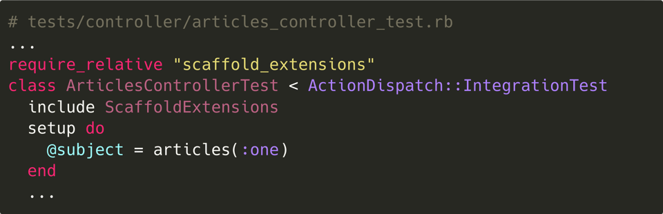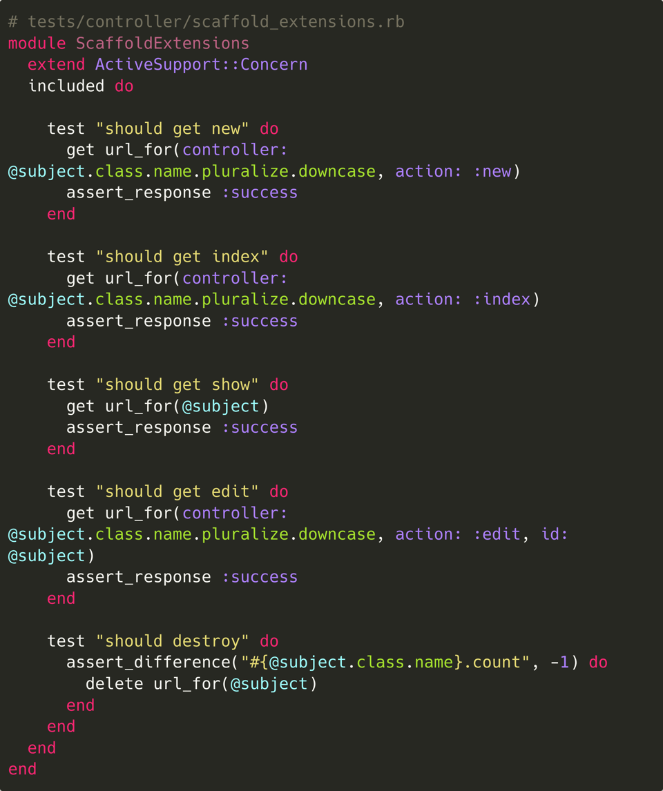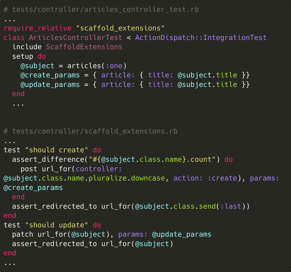 Imagine you generated two scaffolds, one for a “User” object and one for an “Article” object. Your scaffold tests have almost the same code for most CRUD methods, so let’s share them between the tests. To achieve this, we will create a module: