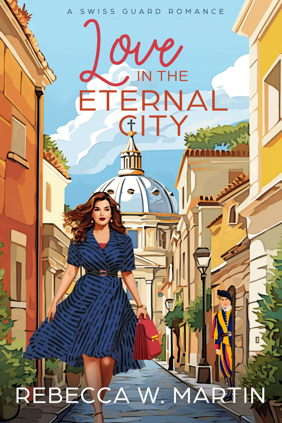 LOOK AT BENI PEEKING OUT OF THE DOORWAY!!! Also the fact that Elena's outfit matches his Swiss Guard uniform delights me to no end. Elena is exactly how I envisioned her. And St. Peter's dome in the background with the cross lined up in the C of City! The fonts, the colors, the overall vibe...I love it so much.