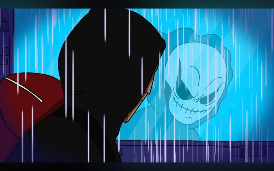 The commentators often underline that he's "resilient," that he can't be killed despite all the punishment he takes in his matches. So Tales From The Top Rope takes this ball and runs with it, spinning it into something supernatural. It's immediately, winsomely goofy – with Collins (who sounds uncannily like Jon Hamm) narrating a Twilight Zone-style opening with grave seriousness about the strange world behind the curtain of wrestling as broken chairs and tables float through the cosmos. "Darby Allin has cheated death all his life," the narrator continues as the wrestler skates through darkened streets with his hood up, with a reflection of the Grim Reaper looking back at him through the reflections in shop windows. Later, Darby is offered a bargain by Death: jump a skateboard over this giant ravine and gain power. Death tries to cheat him, Darby beats him anyway. It's a funny way to get to the heart of his appeal, one which turns a hardcore deathmatch in a local gymnasium into a conduit between earth and the planes of hell.