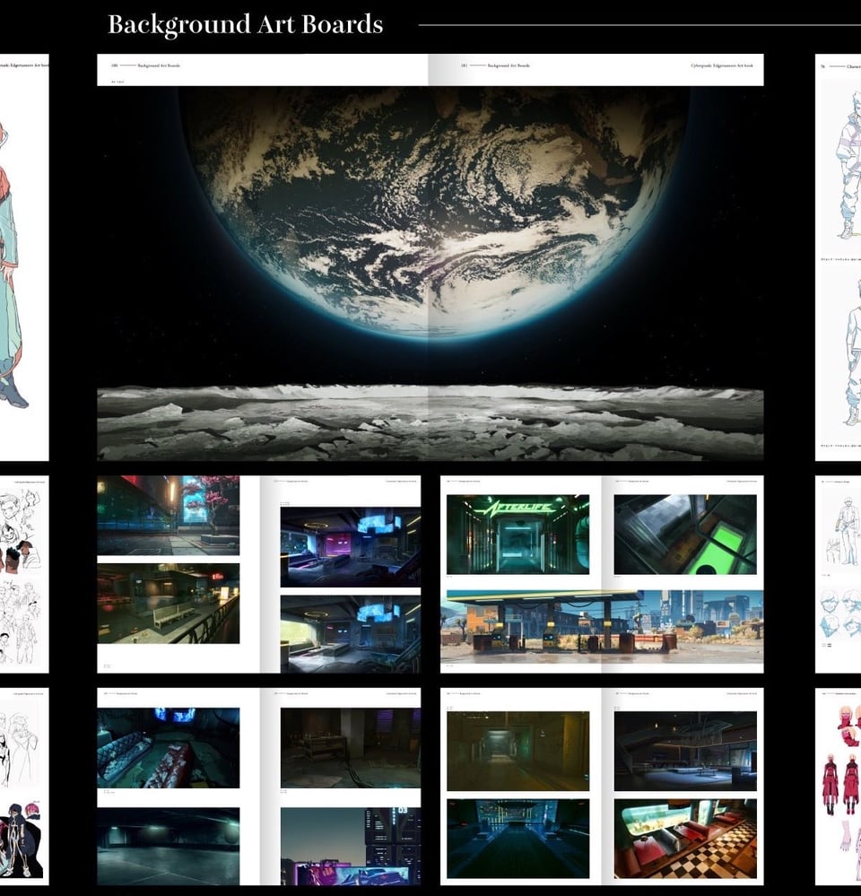 Aside from that, The Art of Cyberpunk: Edgerunners feels like an all-encompassing, albeit perfunctory bookend to the anime’s lifecycle, collecting nearly all of the visual assets produced for the series to date and signalling to the reader the conclusion of any subsequent additions. My personal favorite chapter is the book's final, dedicated to the various key visuals and promotional images for the series which include character portraits, cross-promo images for Cyberpunk 2077’s Edgerunners-themed update, and other minutiae of David, Lucy, and co. hanging out and shooting the shit.