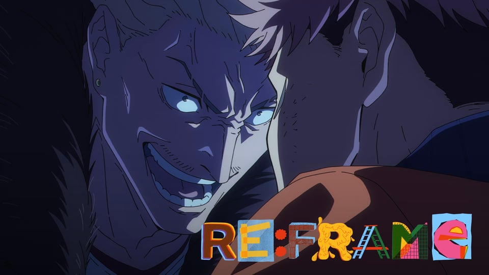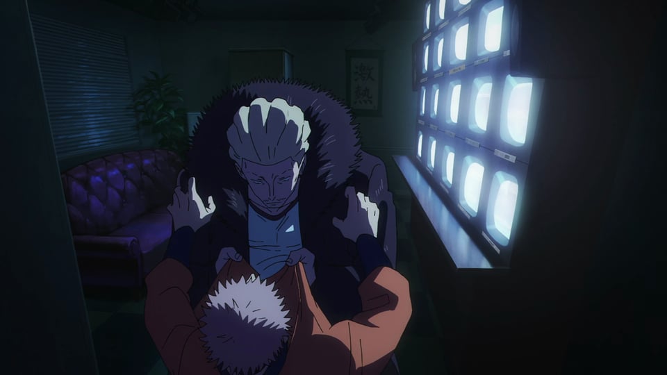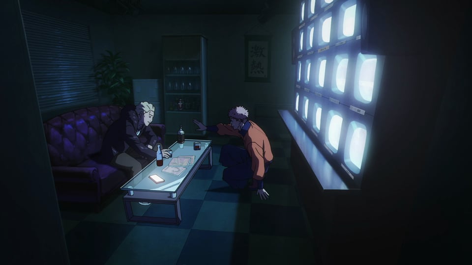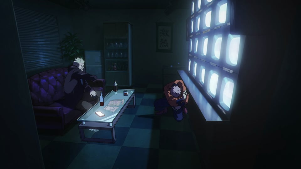 I suppose this is to be expected of a shonen action show such as this, and while fights are their own kind of storytelling, without space in between, it all becomes noise. I'm not immune to the excitement – after more or less declaring myself done with the story after feeling worn out by the manga and the back half of season 2, the blend of Kill Bill and Yutaka Nakamura homages in episode 4, "Perfect Preparation," drew me back in. But what stood out to most, was a shot in the fifth episode, "Passion" – the climactic sequence of the episode lead protagonist Yuji Itadori through an underground fight club to try and meet with the man who runs it – a powerful sorcerer named Hakari. I'll spare you the overly complicated details, but it's the framing of their meeting which stands out. Their conversation is framed from a fly-on-the-wall perspective, a fixed angle from the door through which Yuji enters the room – appropriate for a scene set in a security room, the wall lined with CCTV monitors. The conversation plays out as a long take, the camera never moving. Yuji stands, they sit and drink, Yuji messes up by overdoing it on a lie and slowly backs away, before Hakari attacks him and corners him against the camera.