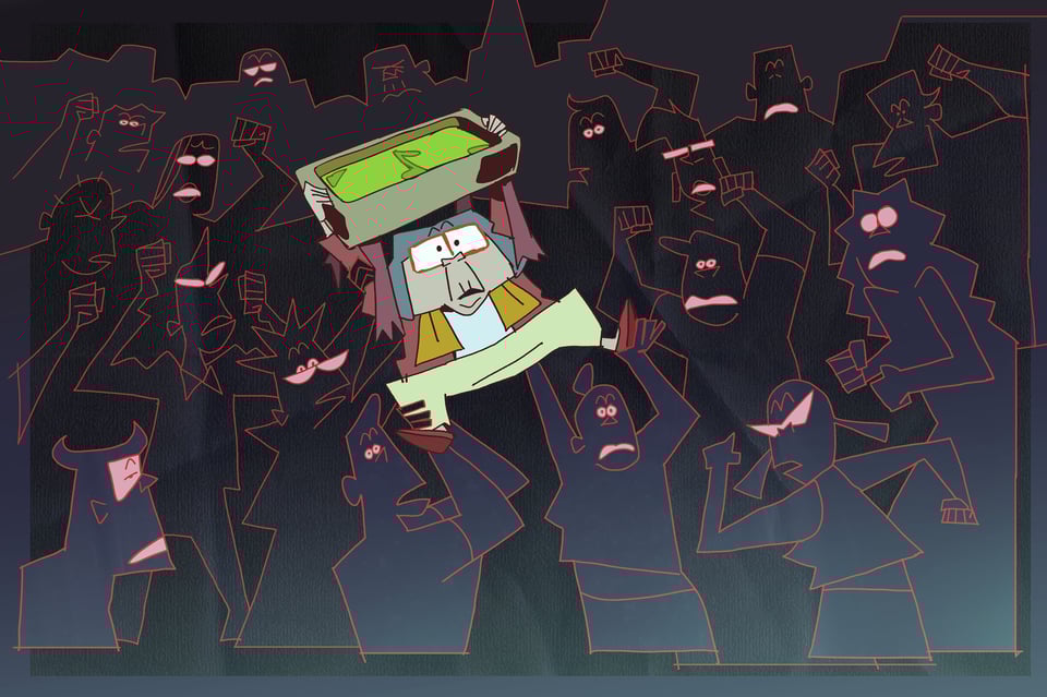 We leaned on the paper cut-out approach for the crowd scenes as well, with a secondary goal of being economical: we could get away with less colors and movement, which gave us more time to focus on the mob-blob design itself.