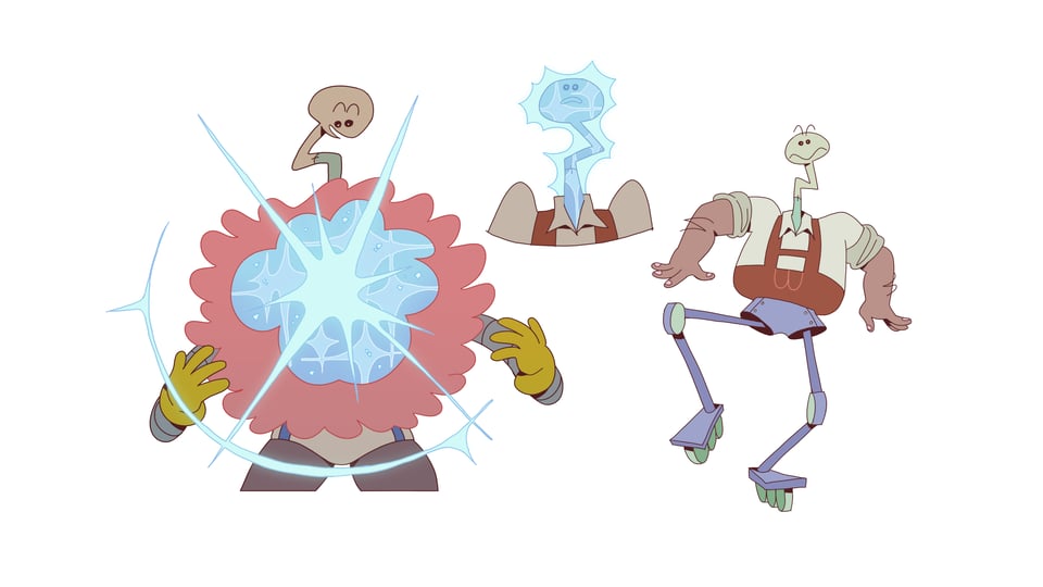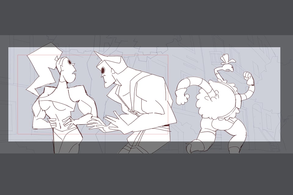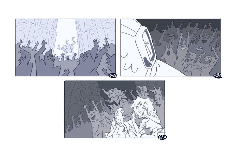 That being said, we were still given enough space for our own interpretation: for example, we never imagined the segment as explicitly taking place in the '80s. While Clip and Tutu's designs have obvious punk inspiration (we used a lot of Debbie Juvenile in Tutu's design), there's a mish-mash of eras when it comes to the other characters which were already present in the storyboard sketches. We thought this made sense, so we pushed it further along: the body-builders are '90s ravers, some club-goers look like '70s disco, the man dancing on the street has a zoot suit/Scatman John thing going on etc.