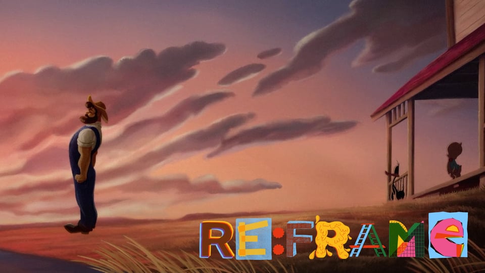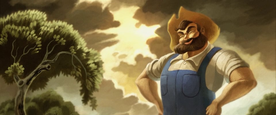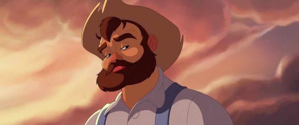 His very existence is a gag because he is visually incongruous with the rest of the scene, something director Peter Browngardt beautifully escalates through another subversion of the rest of the scene. As Farmer Jim inexplicably just walks, or rather, hops off into the sunset, leaving the boys without a father (in itself, a hilarious sendup of a tragic familial backstory), he suddenly turns around in incredibly smooth full animation on 1s, his likeness turning into something Disney-esque.