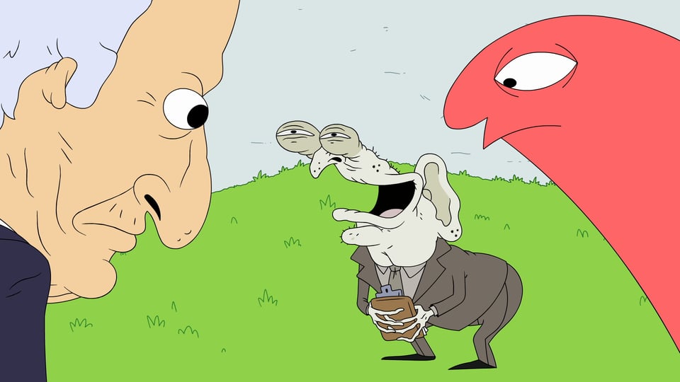 This carries into the season's third episode, "Mole Man," which on one hand returns to the visual palette and median tone of typical Smiling Friends episodes, but is amusingly self-reflective about what exactly that means, as a new character familiar with Pim and Charlie creepily espouses his love of their "realistic dialogue" and how they deal with random things bursting into the room screaming before turning into sand (which has since quickly become a popular meme). I suppose The Simpsons did, in good spirits, nail them to the wall in that regard. But what's fun about the new season so far is how much Hadel, Cusack, and Fromm have already thought about why, and how they can make that in itself funny.