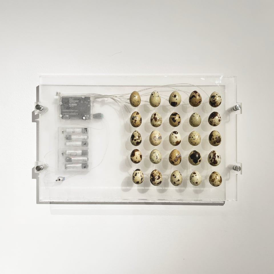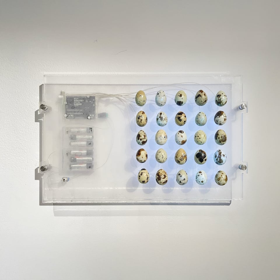 Thank You For Having Me is a light-based sculpture composed of a grid of 25 hollowed quail eggs, each housing an LED and mounted on a reclaimed plexiglass panel, salvaged from the interior of a vintage Apple computer monitor. The quail eggs are wired through an Arduino microcontroller and powered by a battery pack. There are multiple lighting modes: from a kind of uniform brightness to randomised fading/flickering.