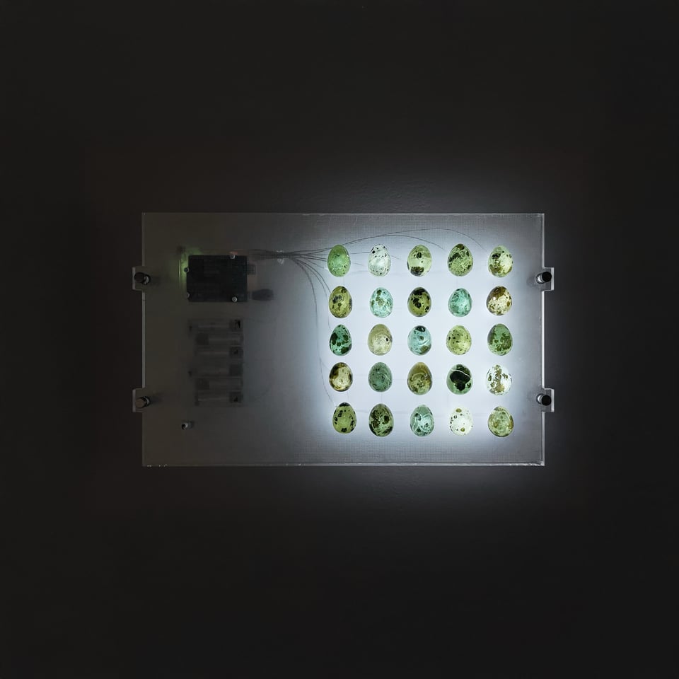 Thank You For Having Me stems from a material investigation into quail eggs as both an object of aesthetic interest and a vessel for memory. It references a place where love was communicated wordlessly through the act of preparing and sharing food. Each illuminated egg becomes a quiet container for such memories. I suggest a speculative technology that harbours hospitality.