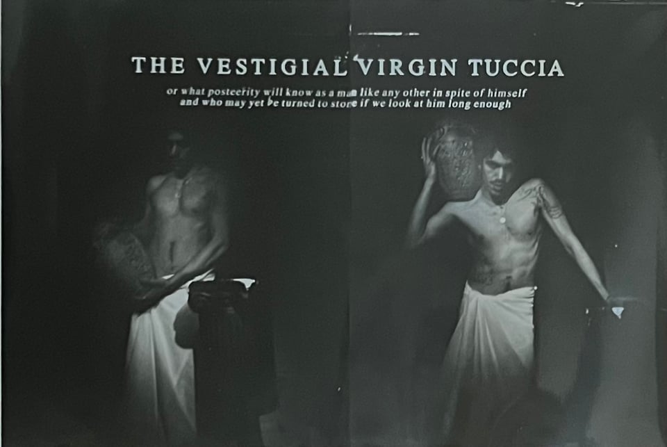 I posed one as Tuccia, the Vestal Virgin, which is a story, mostly told in genre paintings, where Tuccia carried water in a sieve to prove just how hermetically sealed her virginal body was. This is in roman times, I think. A refusal to enter into a symbolic exchange of swallow/spit. Virgins were priestesses because their bodies couldn’t fail. The vestigial body is the body without meaning. The self as atrophied.