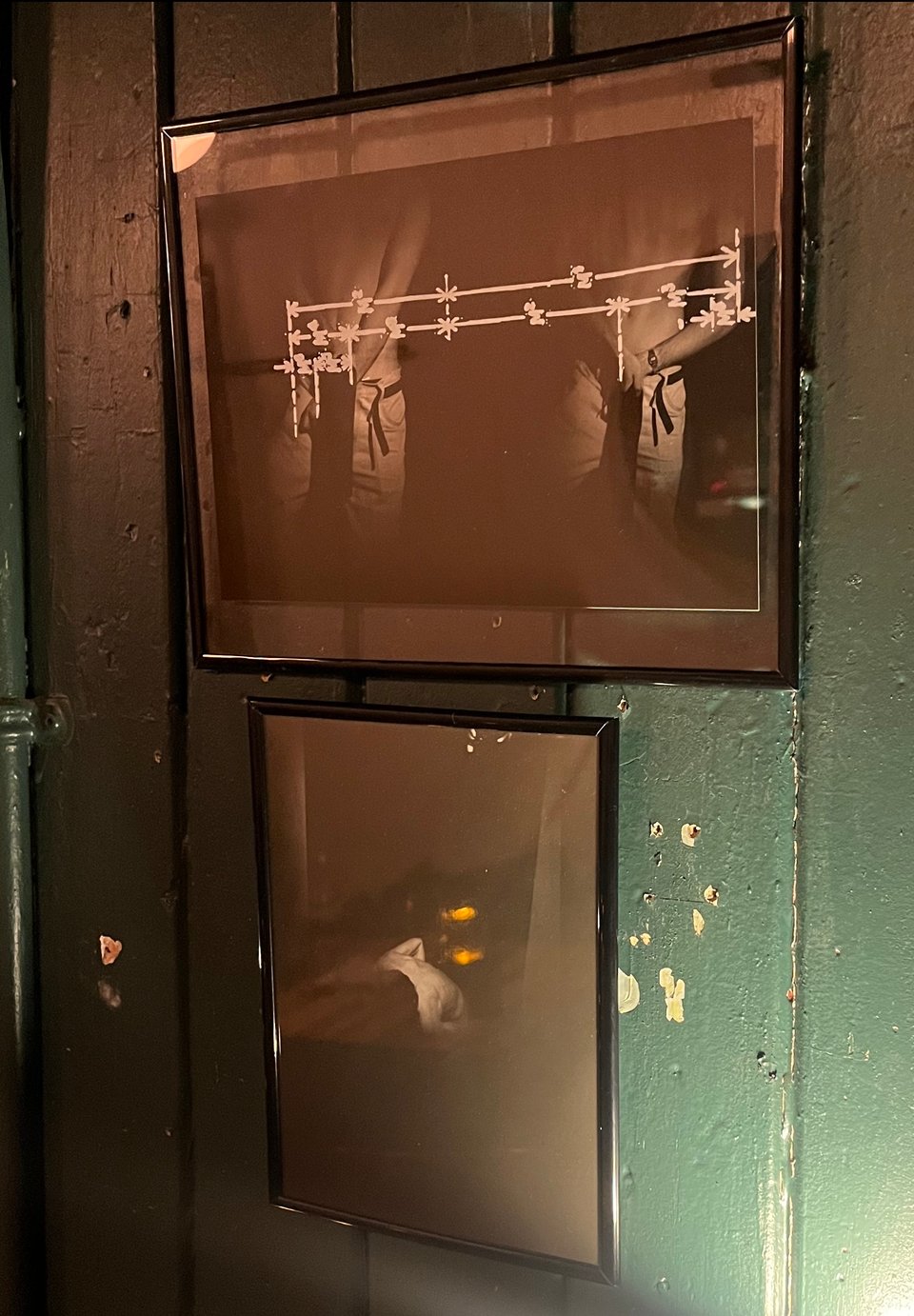 Us Well Behaved was exhibited at a bar/gallery in Montreal. It was exhibited for a month, in spring of 2024. This is to mean that people drank and ate next to my print-clusters.