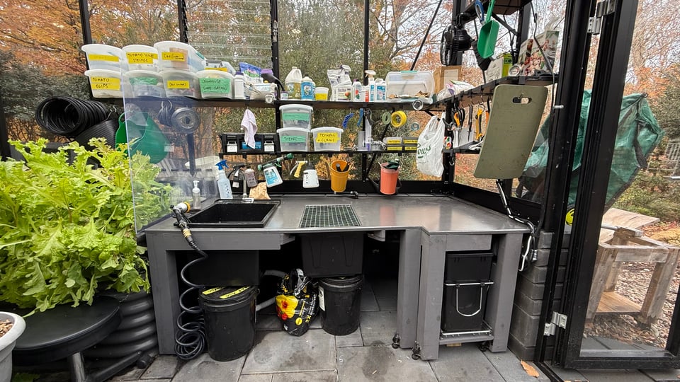 Oh I forgot to tell you yesterday that I also added two additional shelves to the greenhouse potting bench, and then cleaned up the IT and electrical infrastructure of it. Here is a nice picture. Can’t let an accomplishment or chore go by without using it as content and bragging.