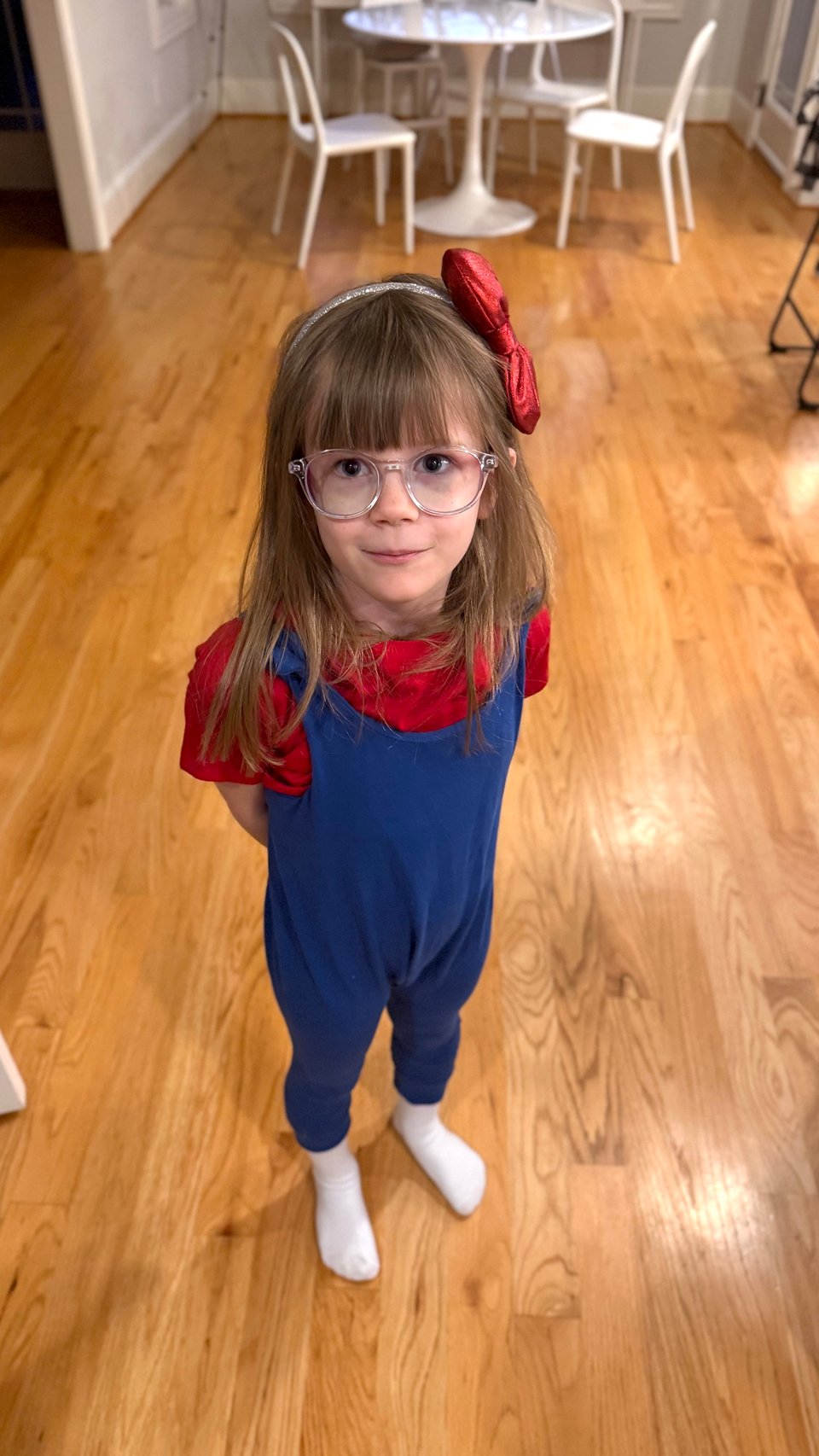 Jane dressed like Mario today, out of the blue, on her own, and it is the fucking best. Also we almost didn’t win our morning car Wordle because it was one of those hands that could have like ten answers (is that a spoiler? I guess only if you use the exact same Wordle tactics as me?) and she was getting SO STRESSED. But we got it on the last guess, so, as they say in Wordle: whew.