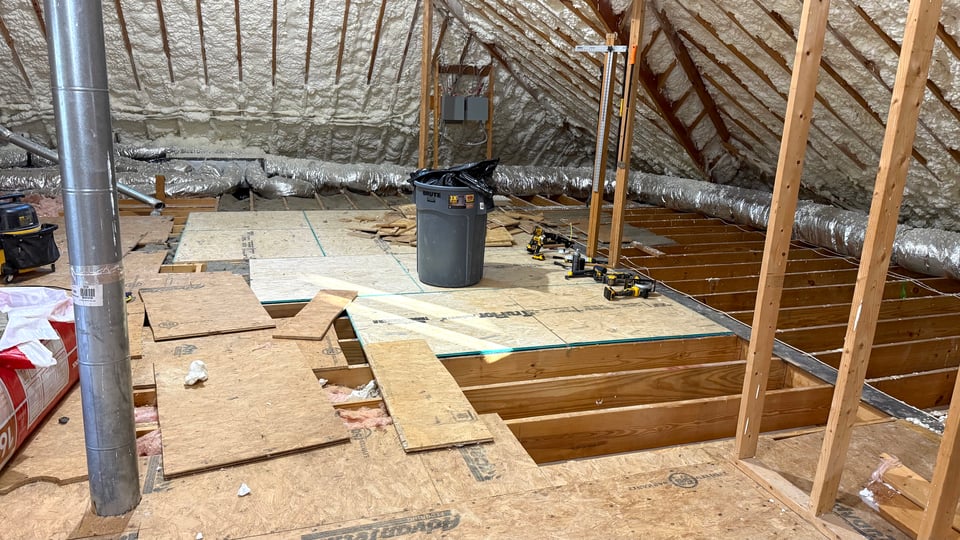 After laying in a pile of sawdust on the floor of the attic and moaning for a while, I got up and… just kept working. Got something like 5-ish more pieces of subfloor in place this weekend, which is a big improvement over last weekend’s one piece. We have placed the equivalent of 5.25 large 4×8 sheets of subfloor down. This works out to 168 square feet. The attic is 3,700 square feet, so that is not really that great. But the area of the attic that is the hard part — the part that already has a subfloor down, and crappy fiberglass insulation underneath it, works out to about 1,600 square feet. The other parts will go much faster (if I ignore how much duct manipulation I’ll have to do). So, you know. Let’s say 9 more weekends for the main floor. That is.. not terrible? March? ish? April if I factor in funerals and whatnot.