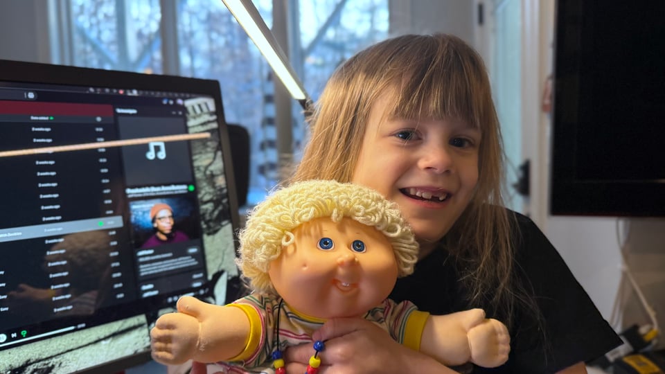 Jane is sick and has no school and it would have been a snow day anyway so, you know, triply absent from school. I slept in till 8 AM and she texted me 569 times on Telegram. Most of them were the dice roll, with an occasional heart emoji or the words “poopy butt” thrown in. I am very glad I put my phone on silent and do not disturb last night. She has come downstairs now, she is sitting next to me. I have just taught her that I write to my friends every day. She is sitting on my desk, with Hayden, one of her Cabbage Patch children. Hi, Jane.