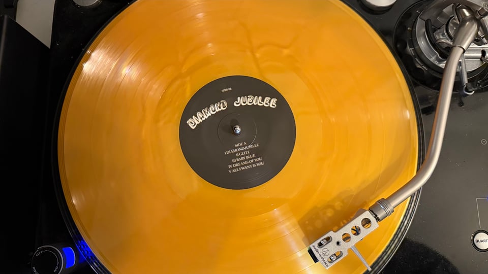 We are listening this morning to Cindy Lee’s 2024 masterpiece Diamond Jubilee, out now on vinyl. Took months after the release of the record for it to get a vinyl release, six months from placing the order to receiving it, two weeks from shipping to arrival at my house, but it is here now and it is glorious. Nice gold vinyl, too. Here I will take a picture of it for you.