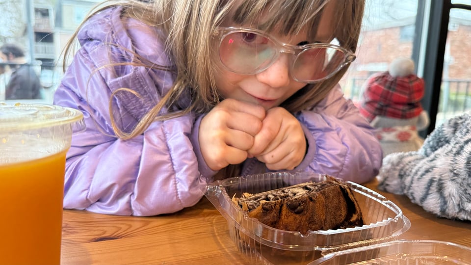 Let’s end with a pleasant Jane story. Jane is great. She makes me happy. Seven is a pretty great age. It was lovely to watch her play at the playground with her friend Ada, they see each other only a few times a year but they always seem so happy to see each other and play. She drew me a nice picture this morning. She is playing Lego Racer 2K. She lets me sleep till 8:00AM. We went to the Ukrainian place again this morning. They did not have any babkas. Jane is handling it much better this trip when they don’t have babkas. But they did have babkas the first time we went there this trip so I leave you with this photo of Jane doing her trademark happy hands with a babka.