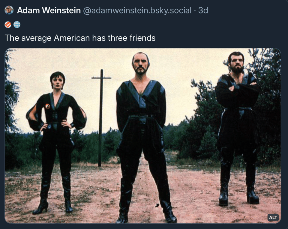 Hey question: what is with all these people making fun of Zuck for saying that the average American only has three friends? Do they think he’s making that up? Do they think it’s not true? Do they just want to glom onto a boring-ass meme and do their own version? Are they bragging that they have more friends than most people? Do they think that’s funny that so many people are lonely? Do they think we live in a world where you can still make harmless memes on the internet? Do they think they’re mocking Zuck instead of… lonely people? Why why why? If I make one with Spacemen 3 am I being clever?