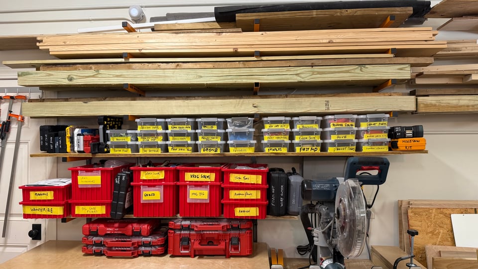 Oh! And I didn’t tell you about my new workshop shelf. It is very exciting. I had all these bins and organizers just piled up on my miter saw stand. Not in the way of actually using the miter saw, but it was annoying. And I fixed it. And now they are all on the wall and it looks awesome. Behold: