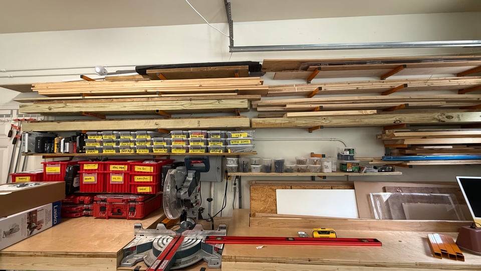 Also did some slight improvements to the recent workshop shelving situation, stabilizing the far right end of the bin shelf, and adding a second shelf where I now keep all my screws. Very excited about this.