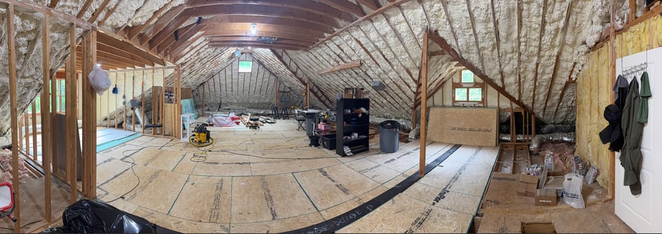 But we are making progress and this weekend we tore down the last unneeded old internal wall, opened up the nice window bay, and got it floored (ignore that pole working on that). So, finally, the attic is now completely open, and we can start to see the shape of things: