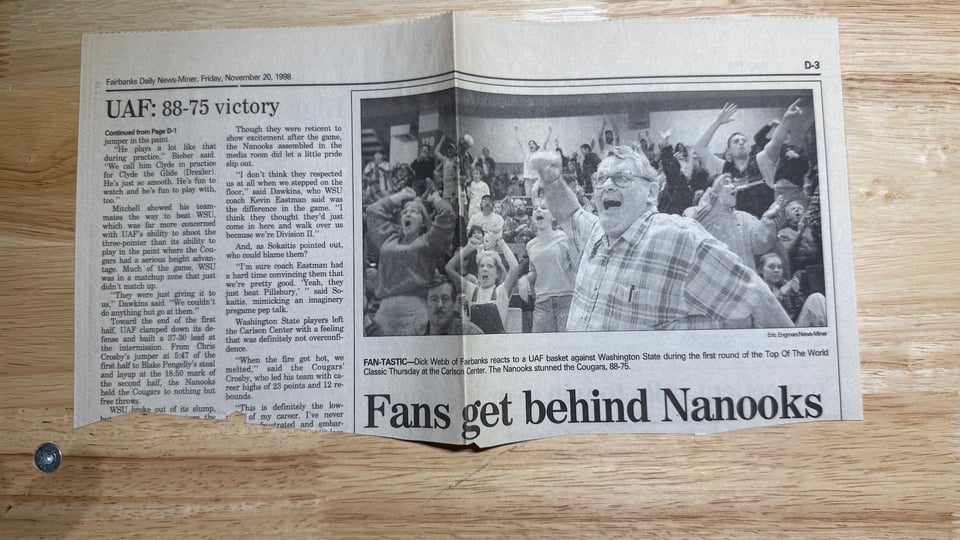 Here’s a picture of my dad in the Newspaper cheering at a Nanooks game: