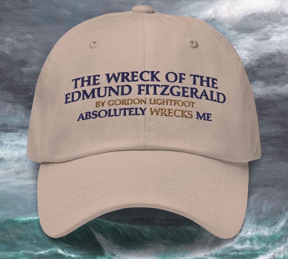 When Nick visited last weekend he brought me a gift: A hat that says “The Wreck of the Edmund Fitzgerald by Gordon Lightfoot absolutely wrecks me.” It goes without saying that I wore it with pride on Tuesday. And Yesterday. And I will wear it today. It is my new winter baseball cap now that we have moved out of weather where one needs a mesh baseball cap.