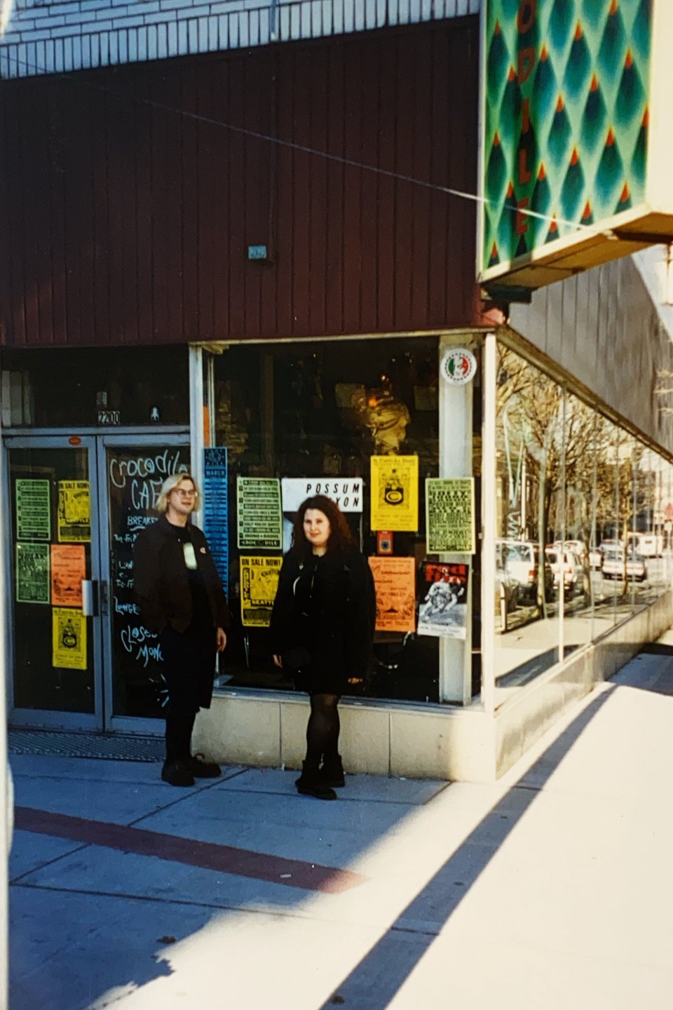 All right maybe my heart is not in this today I am awake, that is nice, but still very sad about Annie. Found this amazing photo of Annie and I in front of the Crocodile in Seattle in 1996. We didn’t play the Croc on that tour, played the Off Ramp. Well, we didn’t. Band we were managing did. But I have since come to know and love the Crocodile. I wish I could read those calendars in the window I bet they are amazing.