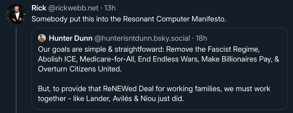But, in this Resonant Computing Manifesto, I feel like I’ve found them again. Here they are. They are working on it. They are, baby steps, reckoning with online fascism in their own way.