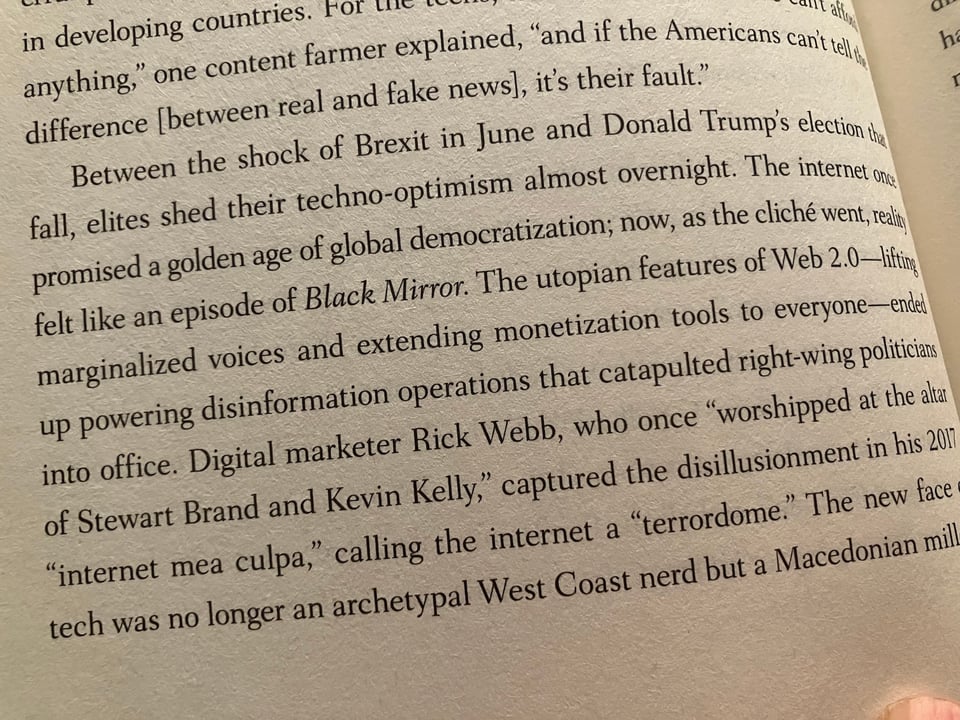 Bill sent me a passage from a new book last night, a sorta cultural review trying to make some sort of unifying sense of this miasma of an era that we live in. It had a passage where it mentioned me in passing, called me an “elite” which, yeah, I guess, from a certain POV, back then at least. And a “tech marketer” which, ugh. Sorry. It quoted from an essay I wrote in 2017 back when I still wrote to be read, and yeah, boy, I do not miss that. The essay went far and wide, got me grief from both sides of the issue. I can’t bear to go back and read it but you can if you want.