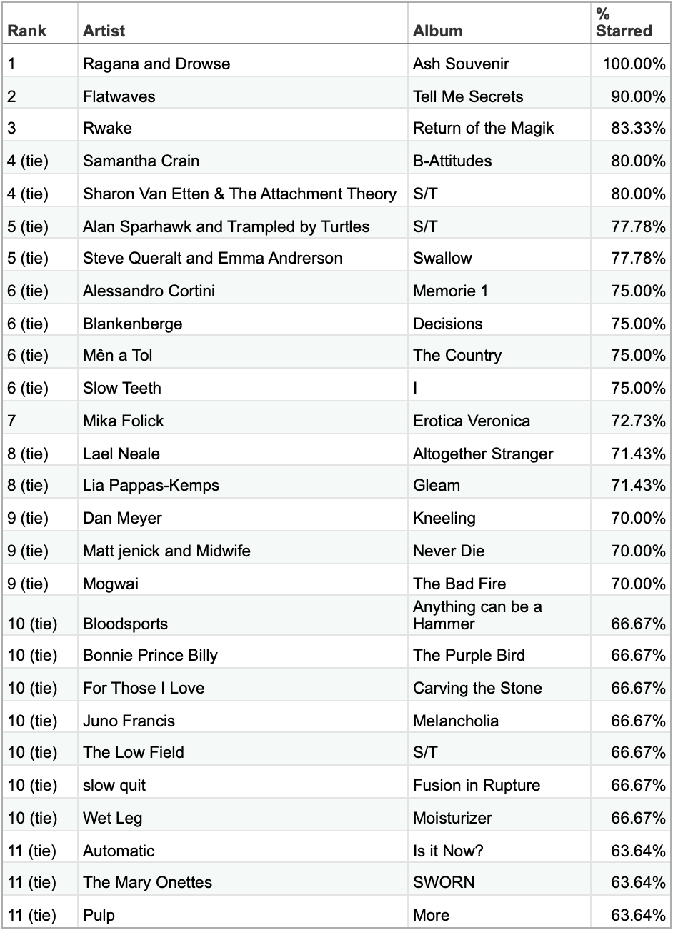 I am ranking the records on a percentage starred metric. This offsets albums with fewer tracks overall getting penalized. I do not think my starring habits have changed a lot through the year, and almost every album only gets two listens, so it is kind of a fair shake. I star anything that strikes my fancy in any way. Some days I am more forgiving, some days I star nothing, but, then, every album gets two listens. On two different days. So it feels about as fair as I can get.